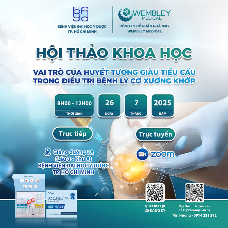 To update professional knowledge and share practical experience in diagnosing and applying platelet-rich plasma for the treatment of osteoarthritis, tendon inflammation, and chronic pain, WEMBLEY MEDICAL, in collaboration with University Medical Center Ho Chi Minh City, is organizing the Seminar: “The Role of Platelet-Rich Plasma in the Treatment of Musculoskeletal Disorders.”
