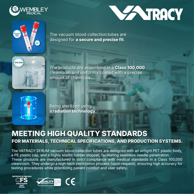 In response to the increasing demand for high-quality vacuum blood collection solutions, Wembley Medical introduces the VATRACY SERUM vacuum blood collection tubes. These tubes are meticulously designed and manufactured to stringent standards, streamlining the testing process, enhancing patient comfort, and prioritizing user safety.