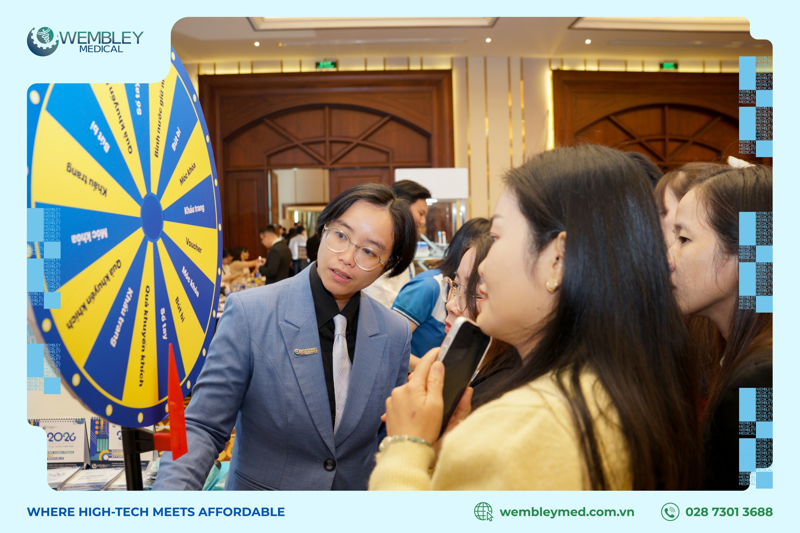 Không chỉ dừng lại ở các giải pháp kỹ thuật, chúng tôi còn kết nối gần hơn với khách tham quan thông qua hoạt động mini-game sôi nổi cùng bộ quà tặng thương hiệu độc đáo, mang đậm dấu ấn riêng của WEMBLEY MEDICAL.