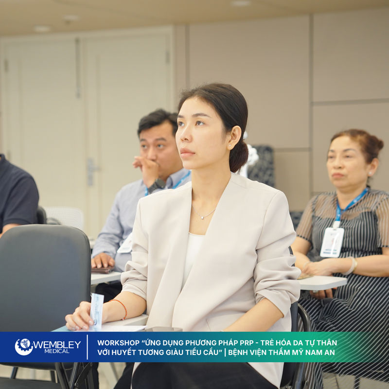 Buổi workshop Ứng dụng phương pháp PRP - Trẻ hóa da tự thân với huyết tương giàu tiểu cầu do Wembley Medical phối hợp tổ chức tại Bệnh viện Thẩm mỹ Nam An, với sự tham dự của đội ngũ bác sĩ, điều dưỡng và kỹ thuật viên chuyên ngành da liễu thẩm mỹ.