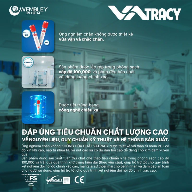 Nắm bắt xu hướng sử dụng ống nghiệm chân không đang ngày càng tăng, Wembley Medical ra mắt sản phẩm ống nghiệm lấy máu chân không không hóa chất VATRACY được thiết kế và sản xuất theo tiêu chuẩn chặt chẽ nhằm hỗ trợ tốt cho quy trình xét nghiệm, mang lại sự thoải mái cho bệnh nhân và đảm bảo an toàn cho người sử dụng.
