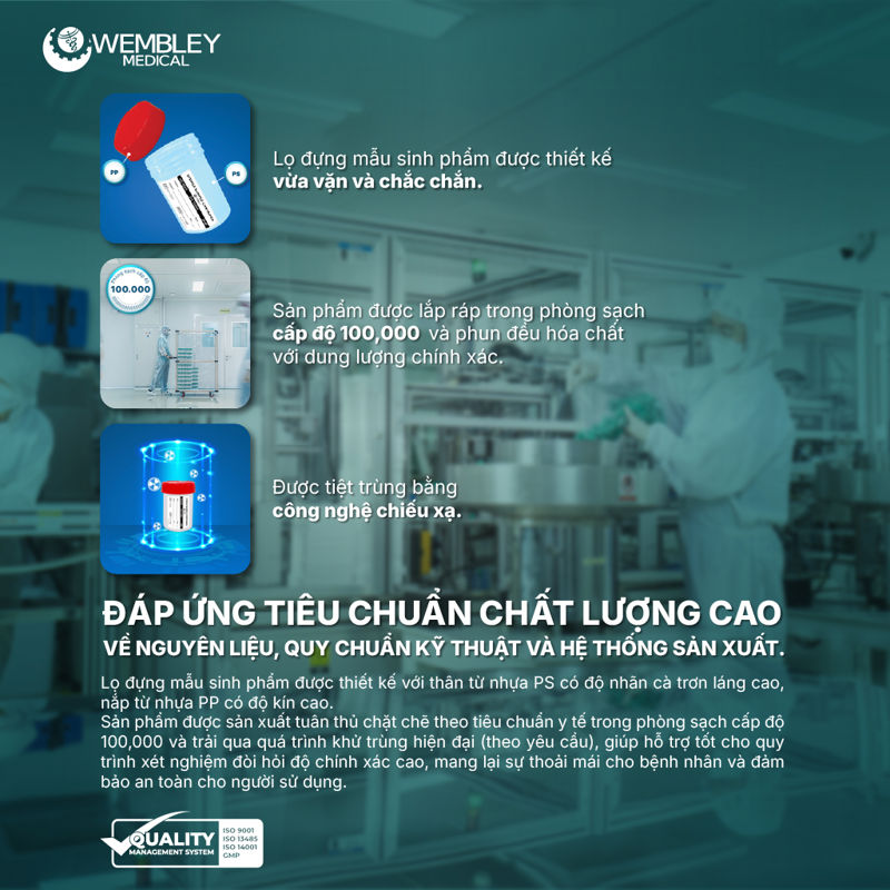 Lọ đựng mẫu sinh phẩm WEMBLEY MEDICAL được sản xuất bằng hệ thống lắp đặt tự động với hệ thống máy móc tiên tiến và hiện đại. Lọ đựng mẫu sinh phẩm WEMBLEY MEDICAL sở hữu những ưu điểm dưới đây: