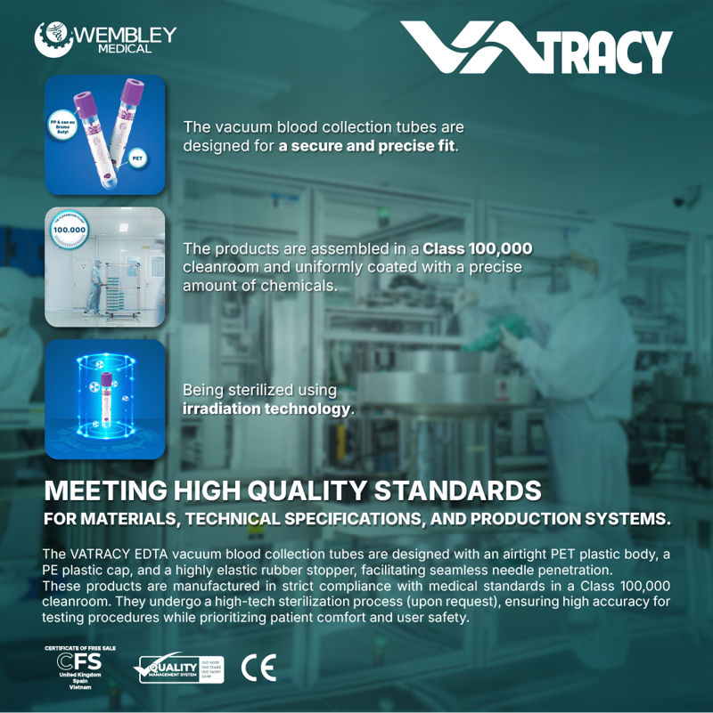In response to the increasing demand for high-quality vacuum blood collection solutions, Wembley Medical introduces the VATRACY EDTA vacuum blood collection tubes. These tubes are meticulously designed and manufactured to stringent standards, streamlining the testing process, enhancing patient comfort, and prioritizing user safety.