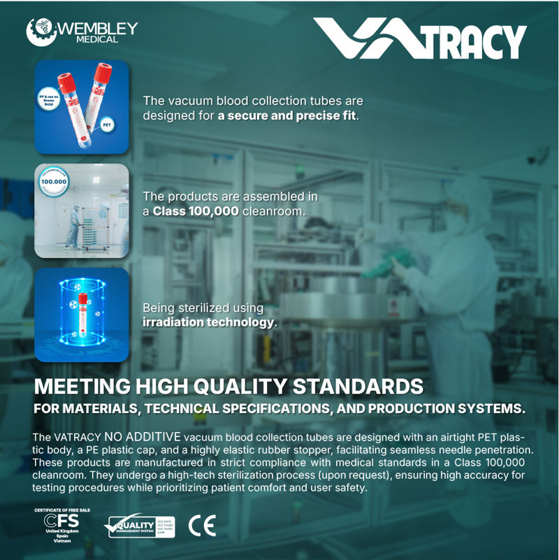 In response to the increasing demand for high-quality vacuum blood collection solutions, Wembley Medical introduces the VATRACY No Additive vacuum blood collection tubes. These tubes are meticulously designed and manufactured to stringent standards, streamlining the testing process, enhancing patient comfort, and prioritizing user safety.