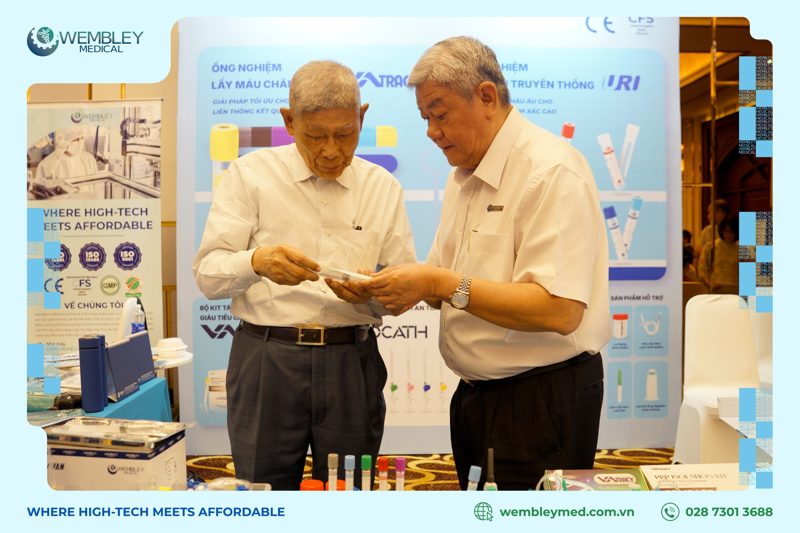 Gian hàng WEMBLEY MEDICAL nhanh chóng trở thành tâm điểm chú ý khi đón tiếp hơn 500 lượt khách tham quan. Tại đây, đội ngũ chuyên gia của chúng tôi đã trực tiếp chia sẻ về hệ sinh thái giải pháp giúp tối ưu hóa vận hành và kiểm soát sai số tiền phân tích, nổi bật với các dòng sản phẩm chủ lực: Ống nghiệm lấy máu chân không VATRACY, Ống nghiệm Lấy máu Chân không Bảo quản DNA/RNA ngoại bào VATRACY và dòng Ống Nghiệm Lấy Máu URI. Bên cạnh đó, WEMBLEY MEDICAL còn mang đến nhiều danh mục vật tư y khoa công nghệ cao khác, góp phần nâng cao chất lượng chăm sóc và điều trị tại các cơ sở y tế.