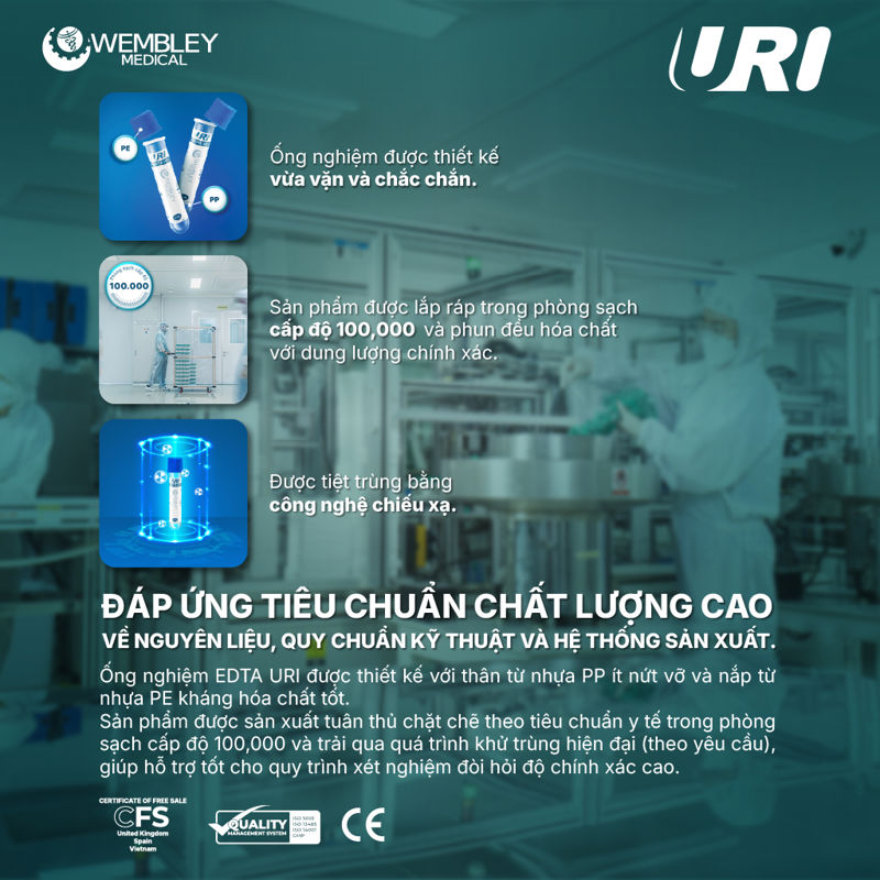 Với những yêu cầu nghiêm ngặt về kỹ thuật xét nghiệm trong chẩn đoán bệnh, ống nghiệm lấy máu EDTA URI được thiết kế và sản xuất theo tiêu chuẩn chặt chẽ nhằm hỗ trợ tốt cho quy trình xét nghiệm đòi hỏi độ chính xác cao.